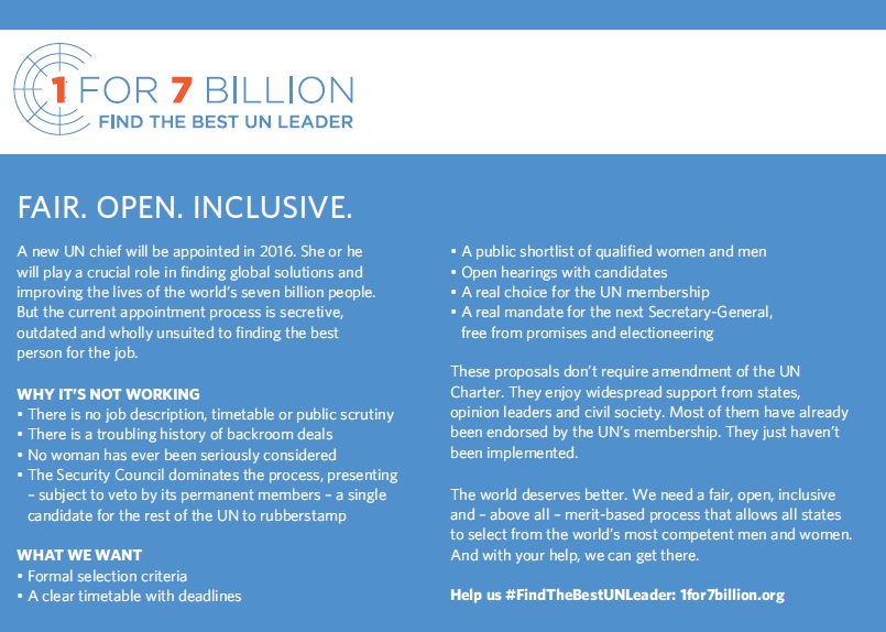 Last year, UNA-UK co-founded 1 for 7 Billion, a global movement of over 170 million people calling for a better process. The campaign’s proposals have widespread and long-standing support from member states.