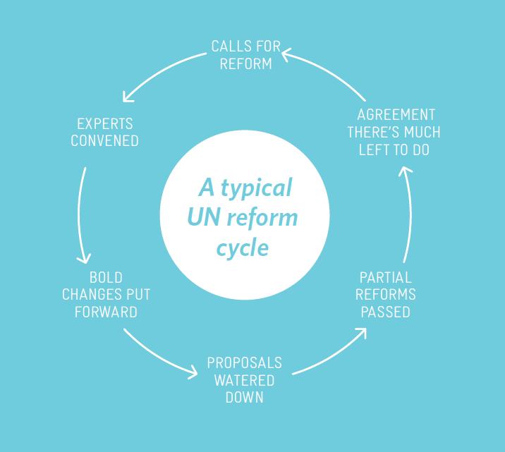 It was with this exercise in mind that UN expert Professor Ed Luck wrote his starkly titled article, “How Not to Reform the United Nations”, in 2005. He considered the panel to be emblematic of the UN’s approach to reform, “following recurring patterns and producing largely predictable results”. A simplified version of this pattern can be found below – its six-step cycle will be familiar to UN watchers.