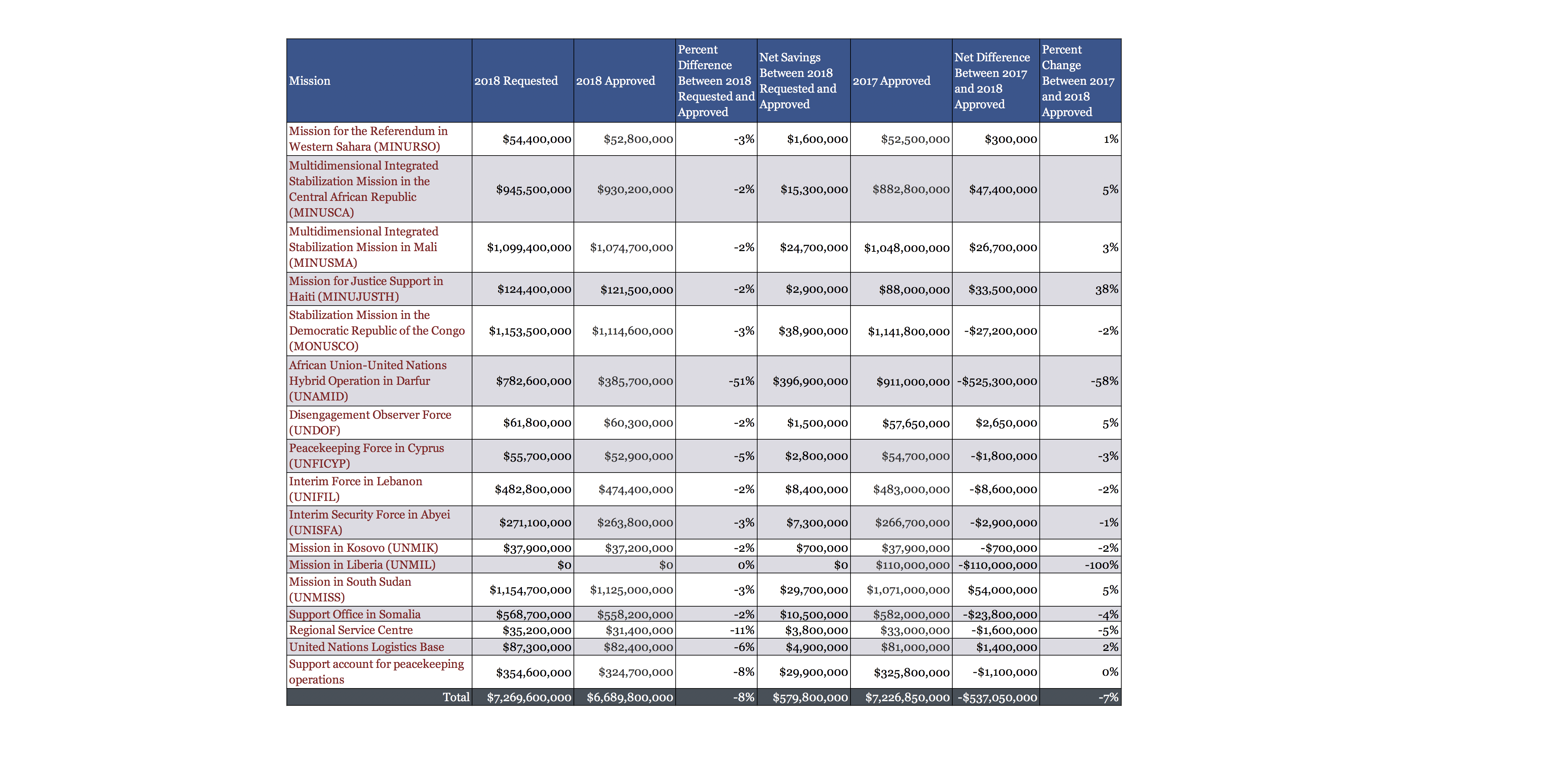 2017 and 2018 Peacekeeping Budget Comparison