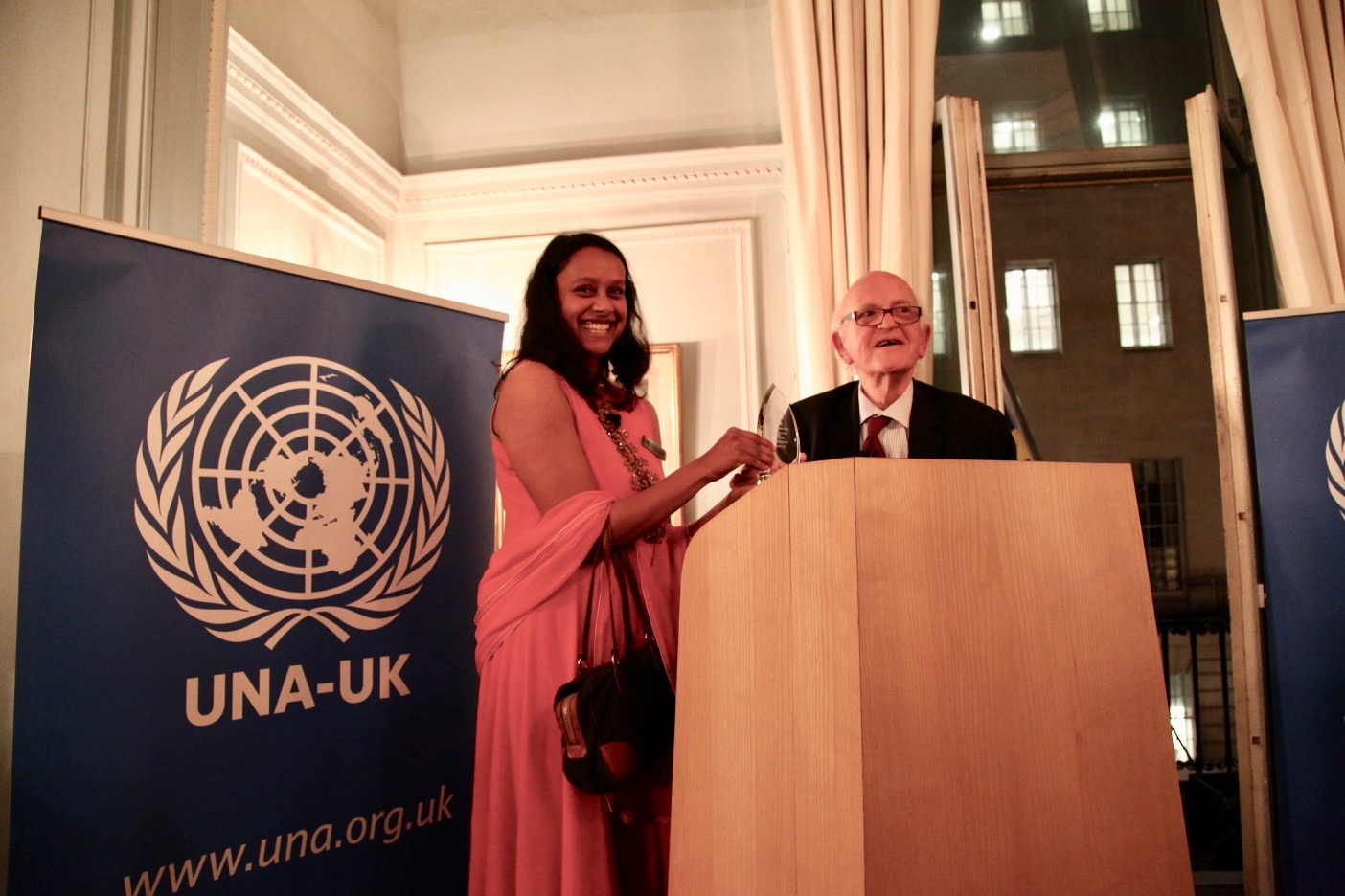The Sir Brian Urquhart Award was presented to Lord Judd by UNA-UK Executive Director Natalie Samarasinghe, who also spoke about the importance of the UN at a time when global issues transcend national borders. Natalie emphasised the need to turn our attention away from debates on whether we need the UN and towards how we make it work better. To boost public support for the UN, Natalie proposed for UN Day to become a day when the Government reaffirms its commitment to the UN and when school children learn about the Organisation.